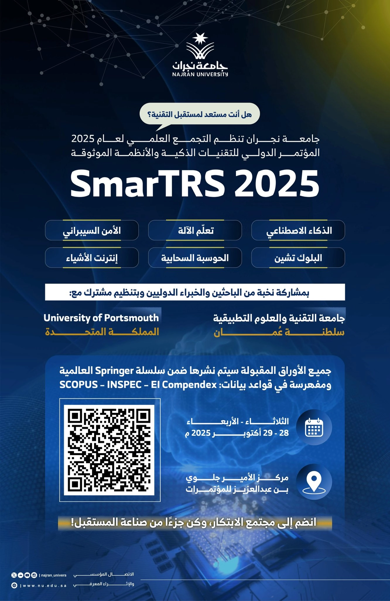 null جامعة نجران تنظم التجمع العلمي لعام 2025 "المؤتمر الدولي للتقنيات الذكية والأنظمة الموثوقة SmarTRS 2025"